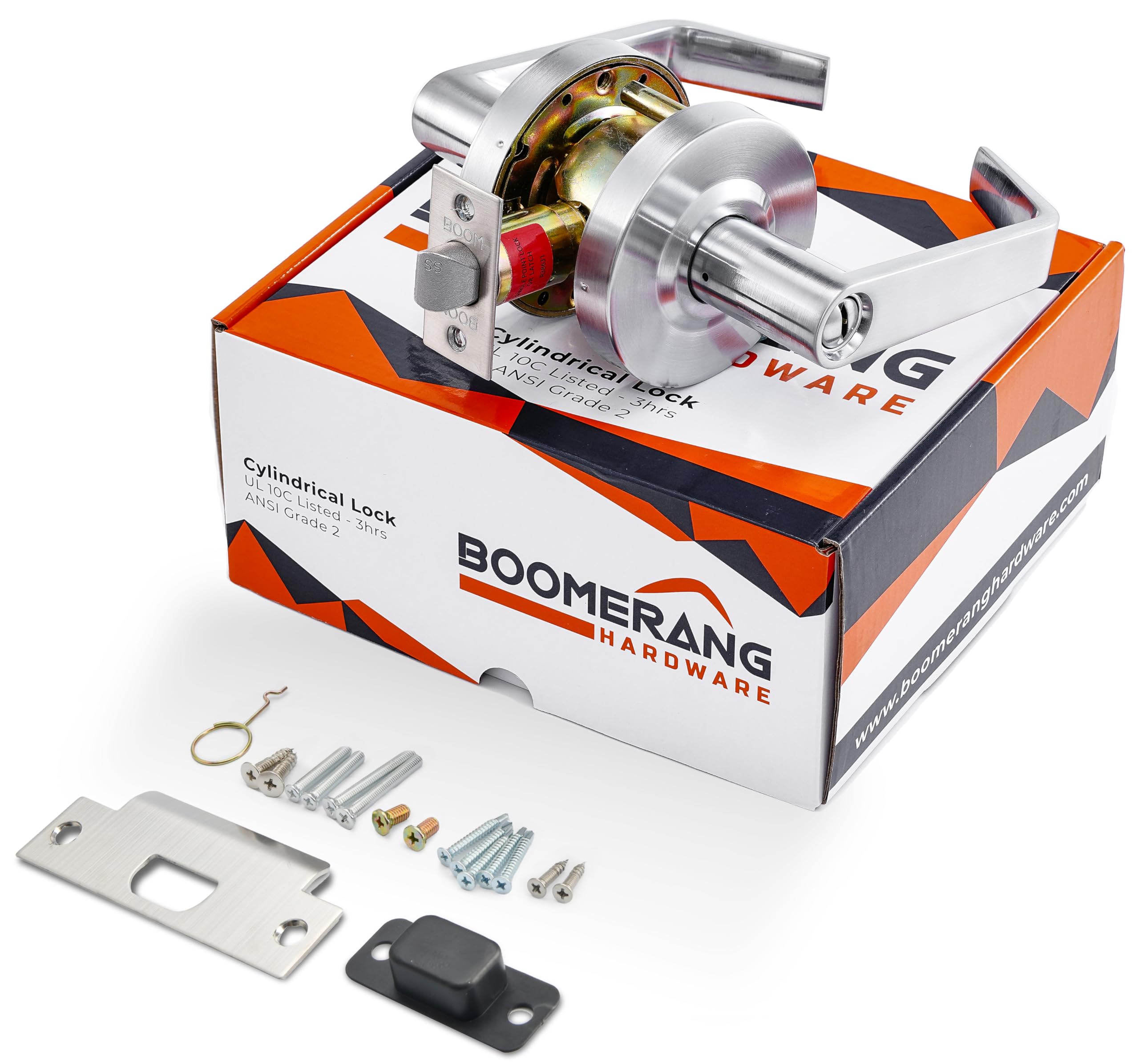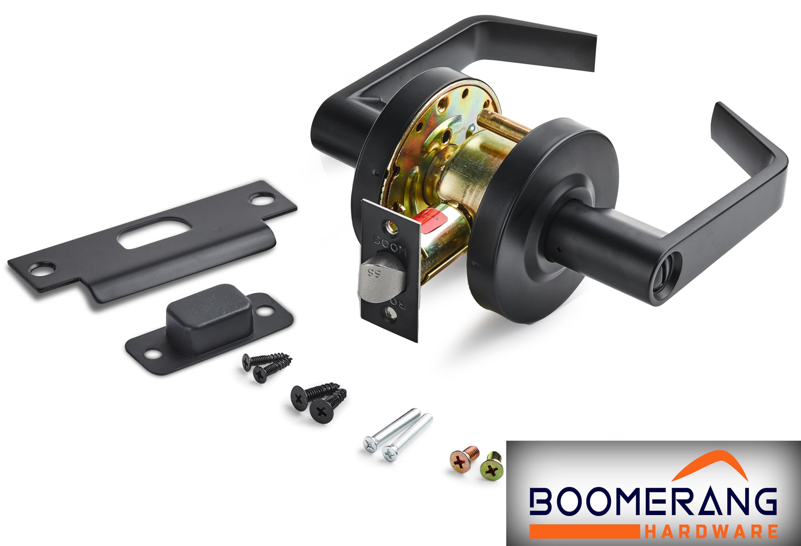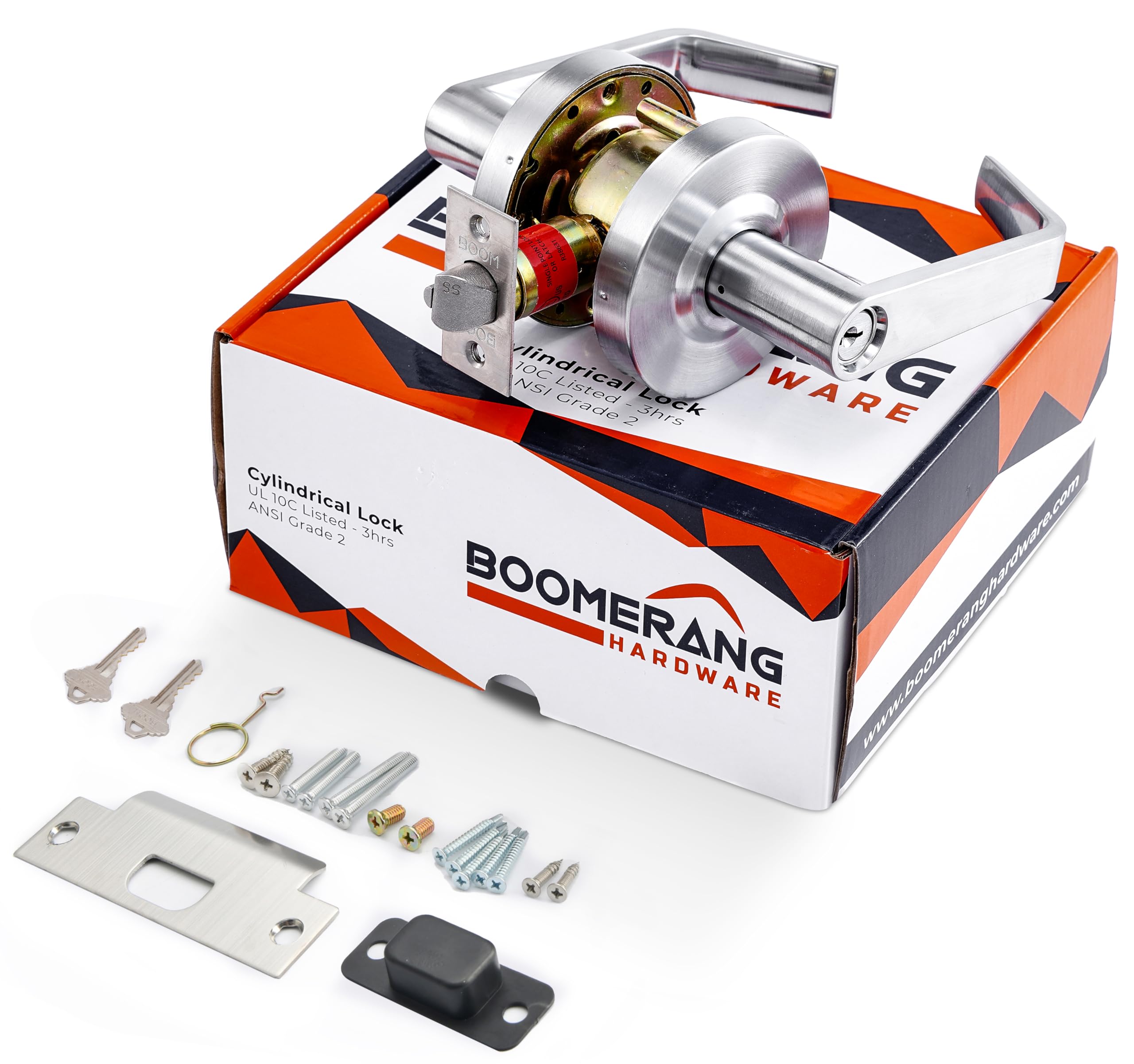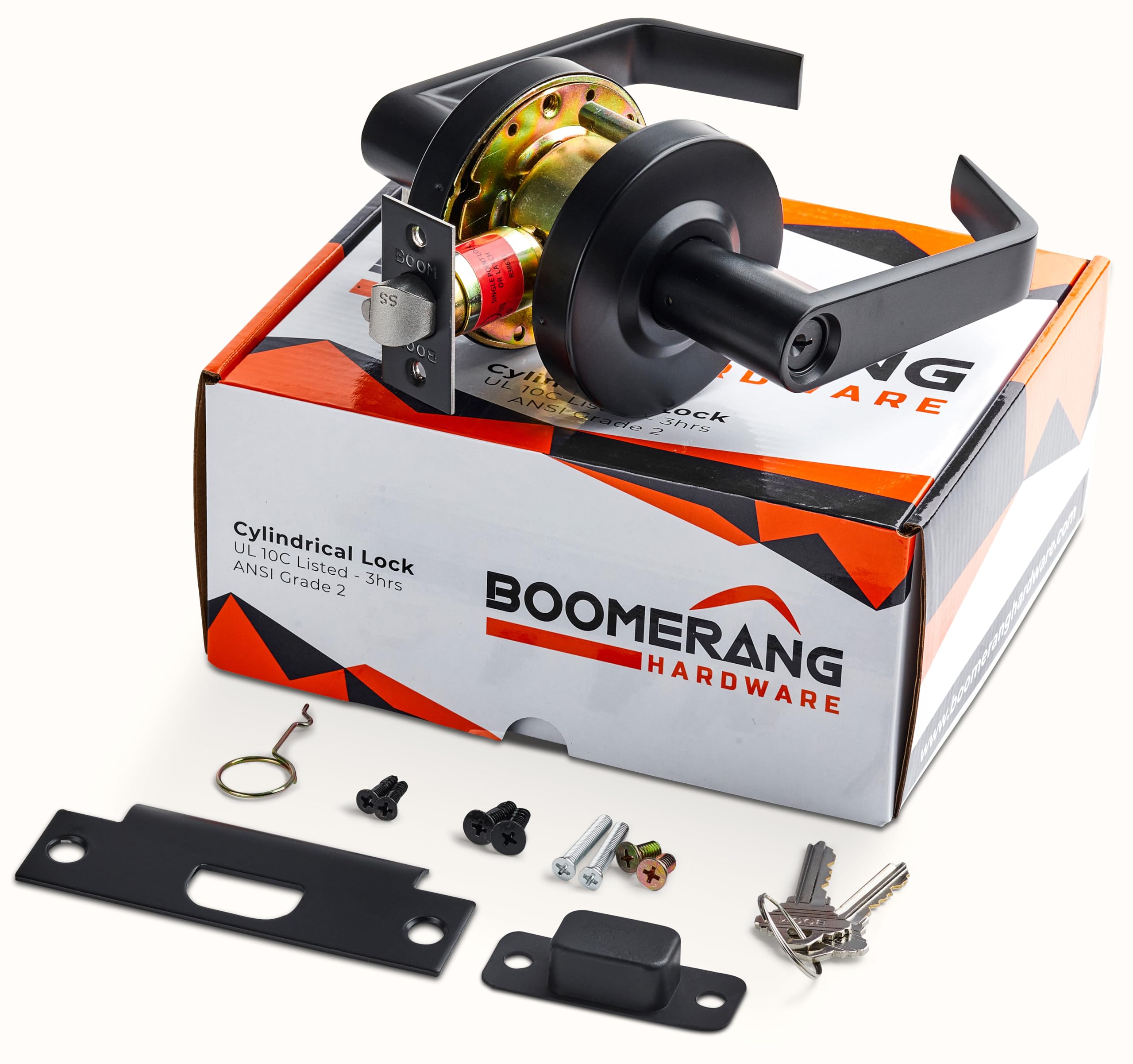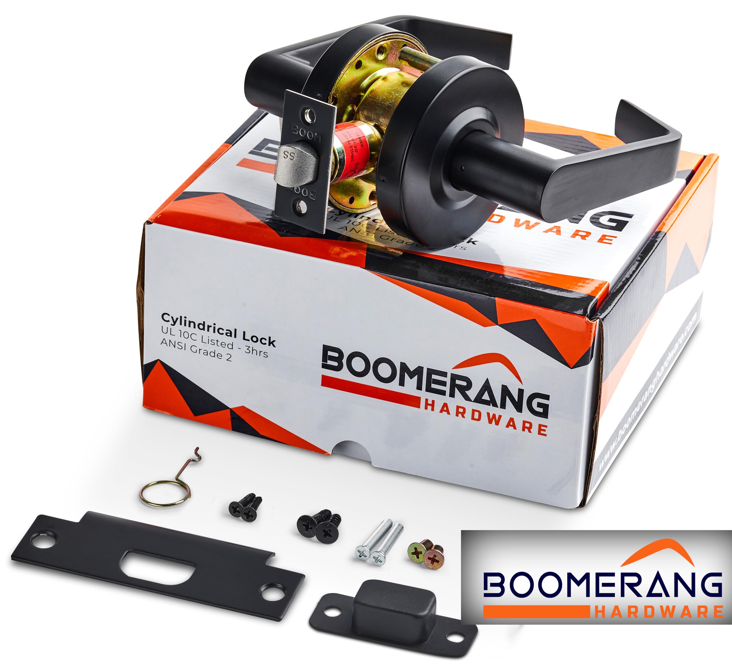 WHAT'S IN A BOX: Each box Boomerang Hardware lever door handle locks includes 1 cylindrical lockset, screws and bolts, user-friendly instructions, 1 ANSI strike, 1 reversible latch unit. The keyed locking functions (Entry, Classroom and Storeroom) include 2 pre-cut keys (C-Keyway (6 pin cylinder) that are re-keyable. The heavy-duty door closer features cold-rolled steel, machined and threaded hubs, and locking nuts to securely bolt the chassis to the door, thereby preventing loosening of the lockset even with hundreds of uses per day.