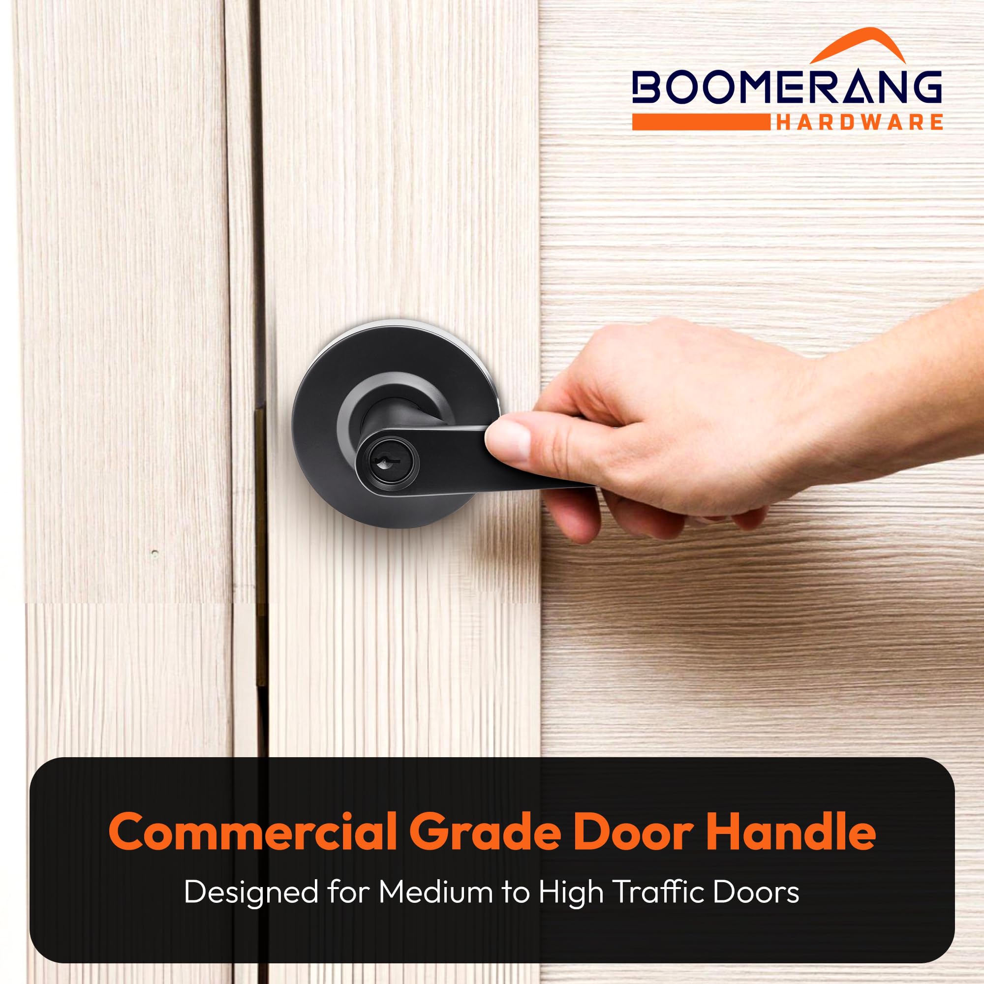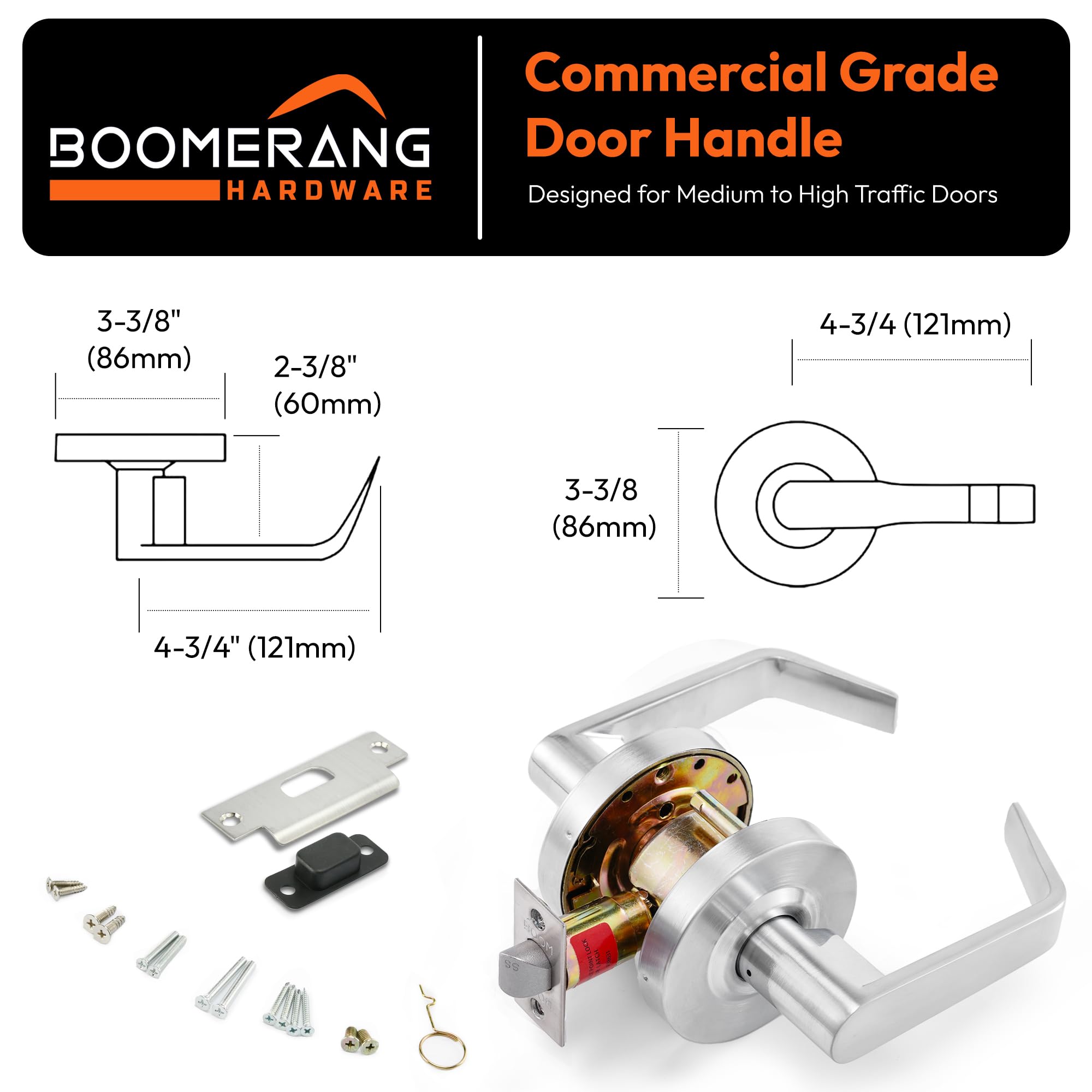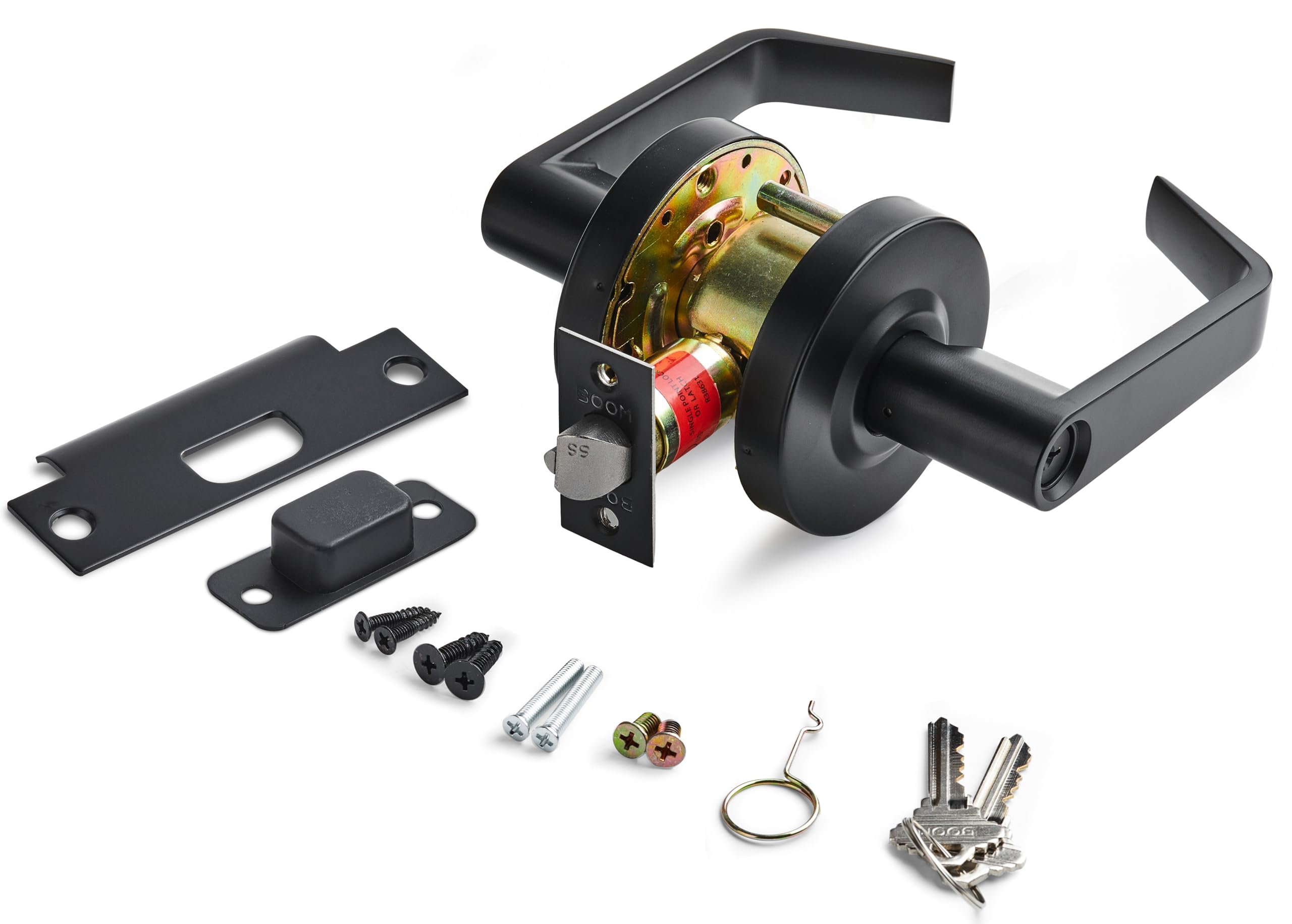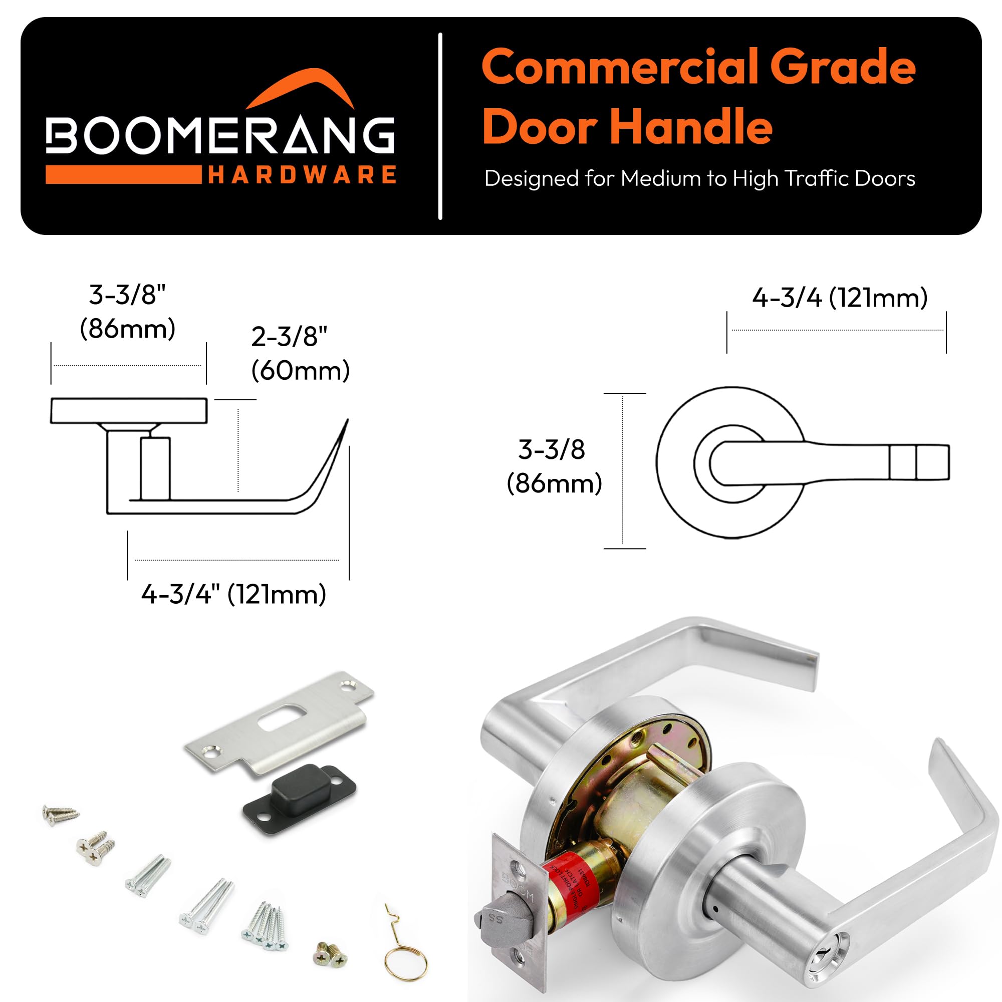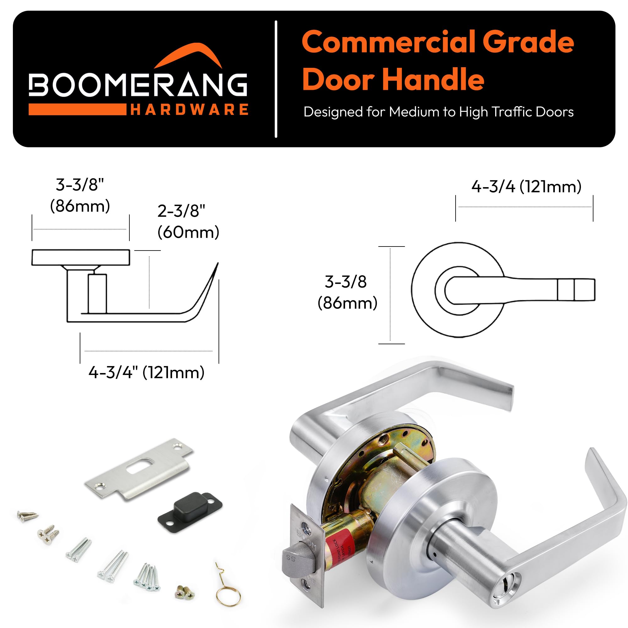 WHAT'S IN A BOX: Each box Boomerang Hardware lever door handle locks includes 1 cylindrical lockset, screws and bolts, user-friendly instructions, 1 ANSI strike, 1 reversible latch unit. The keyed locking functions (Entry, Classroom and Storeroom) include 2 pre-cut keys (C-Keyway (6 pin cylinder) that are re-keyable. The heavy-duty door closer features cold-rolled steel, machined and threaded hubs, and locking nuts to securely bolt the chassis to the door, thereby preventing loosening of the lockset even with hundreds of uses per day.