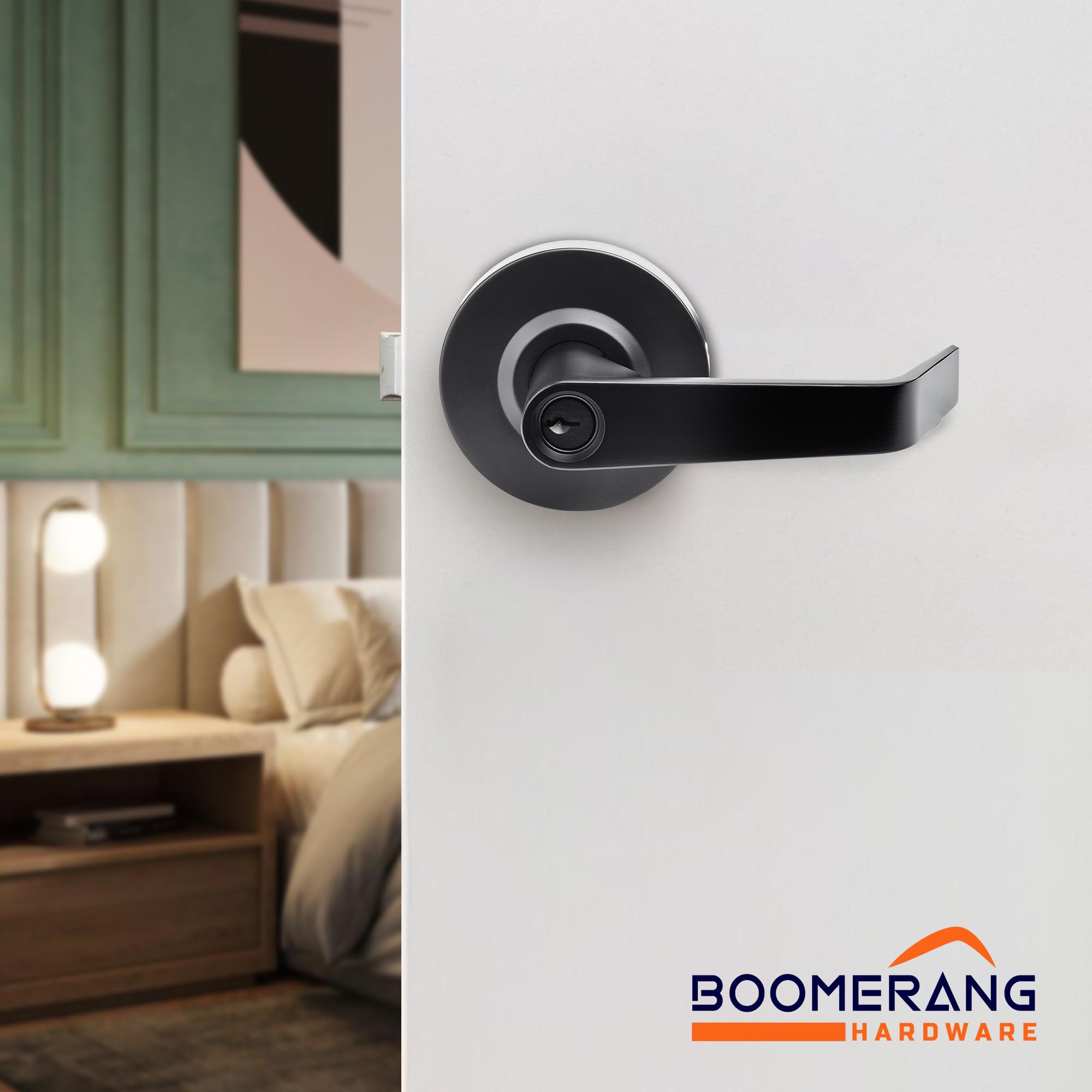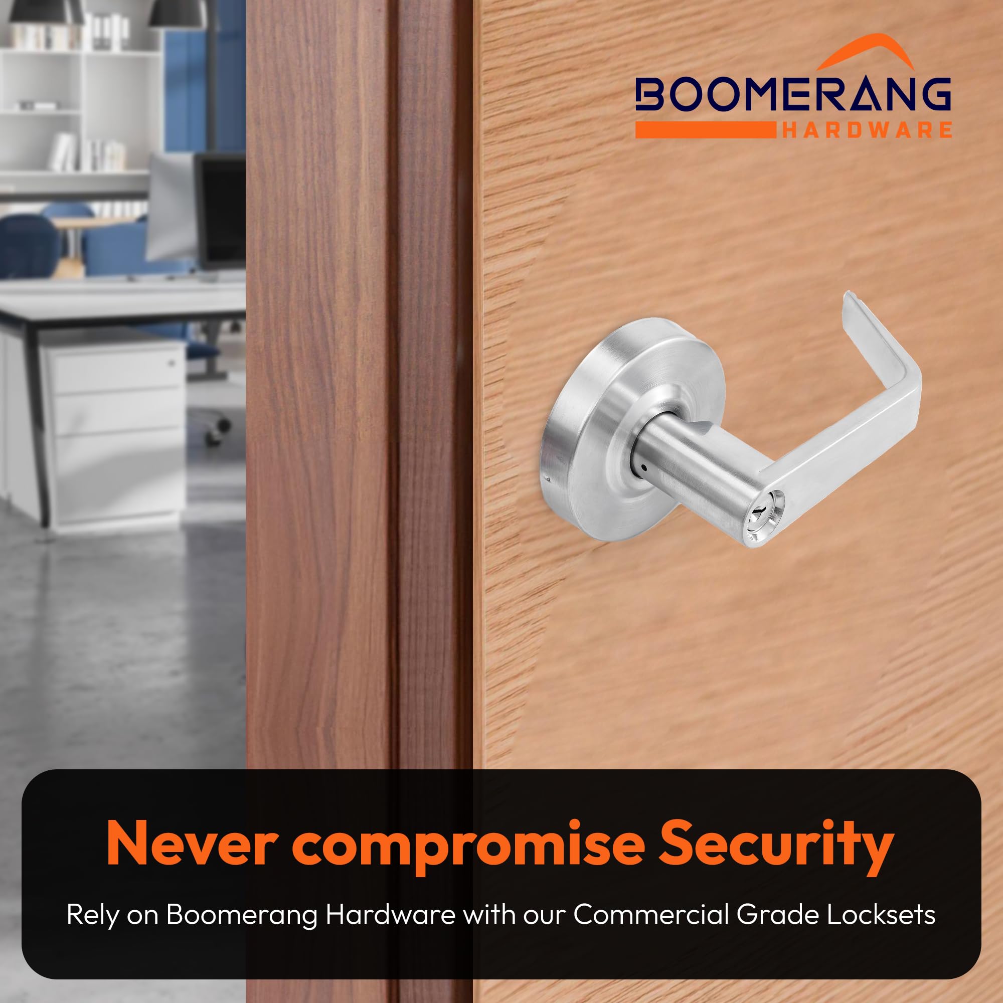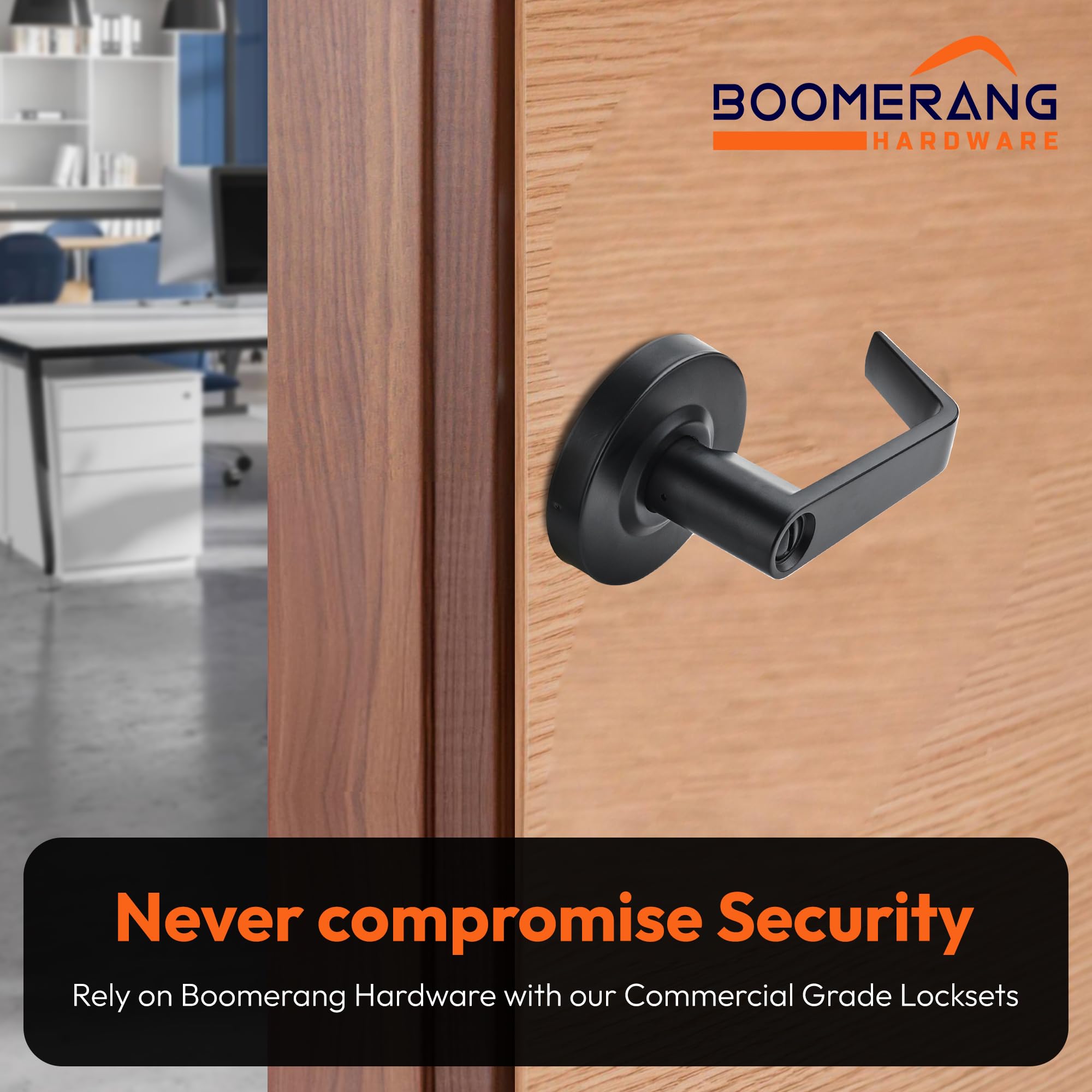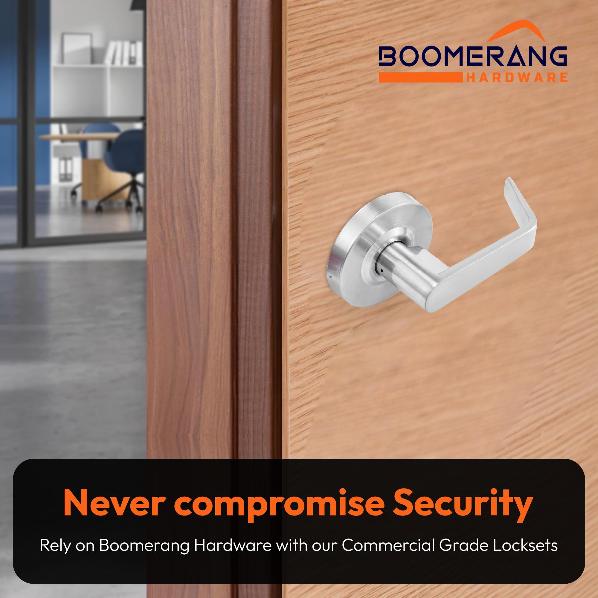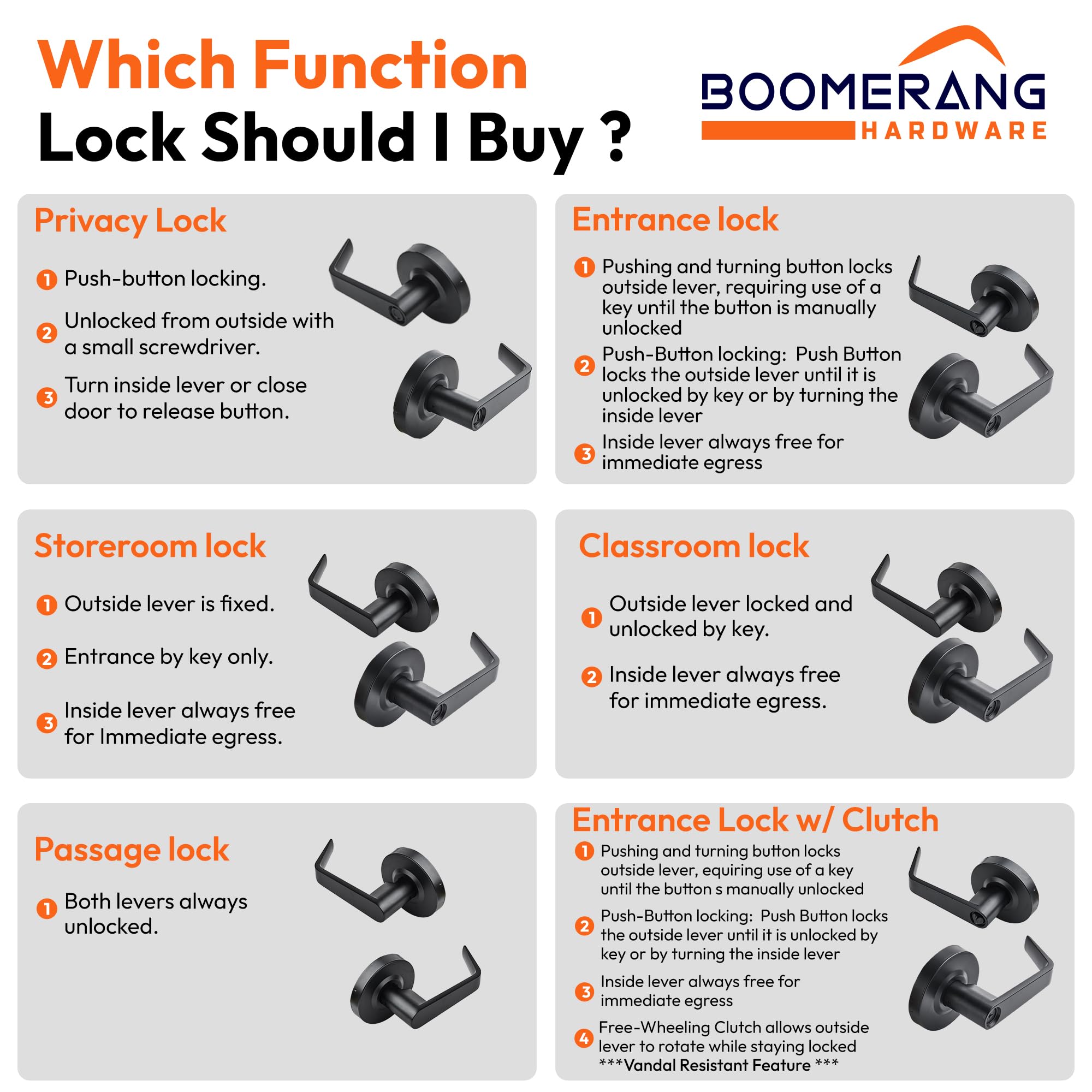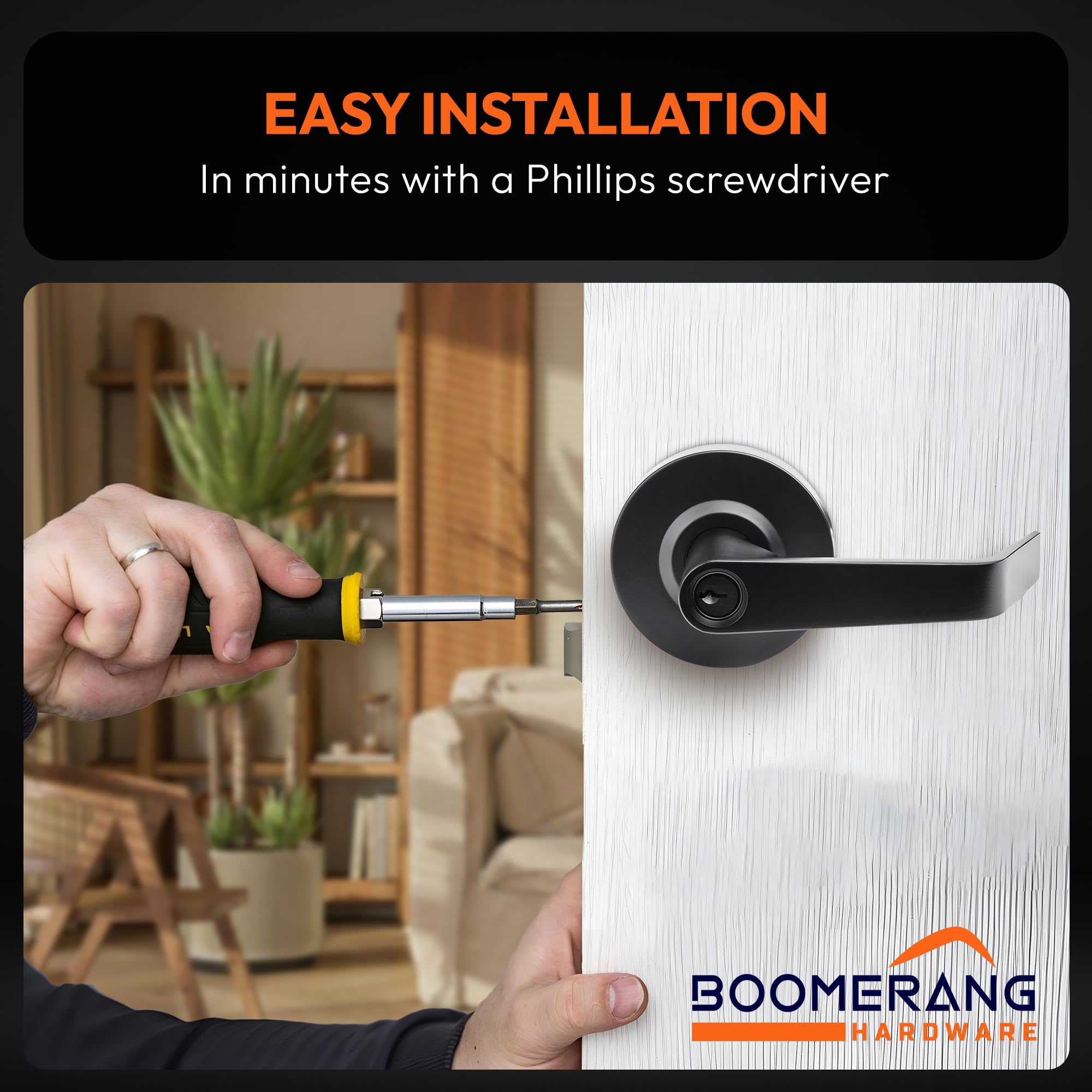 WHAT'S IN A BOX: Each box Boomerang Hardware lever door handle locks includes 1 cylindrical lockset, screws and bolts, user-friendly instructions, 1 ANSI strike, 1 reversible latch unit. The keyed locking functions (Entry, Classroom and Storeroom) include 2 pre-cut keys (C-Keyway (6 pin cylinder) that are re-keyable. The heavy-duty door closer features cold-rolled steel, machined and threaded hubs, and locking nuts to securely bolt the chassis to the door, thereby preventing loosening of the lockset even with hundreds of uses per day.