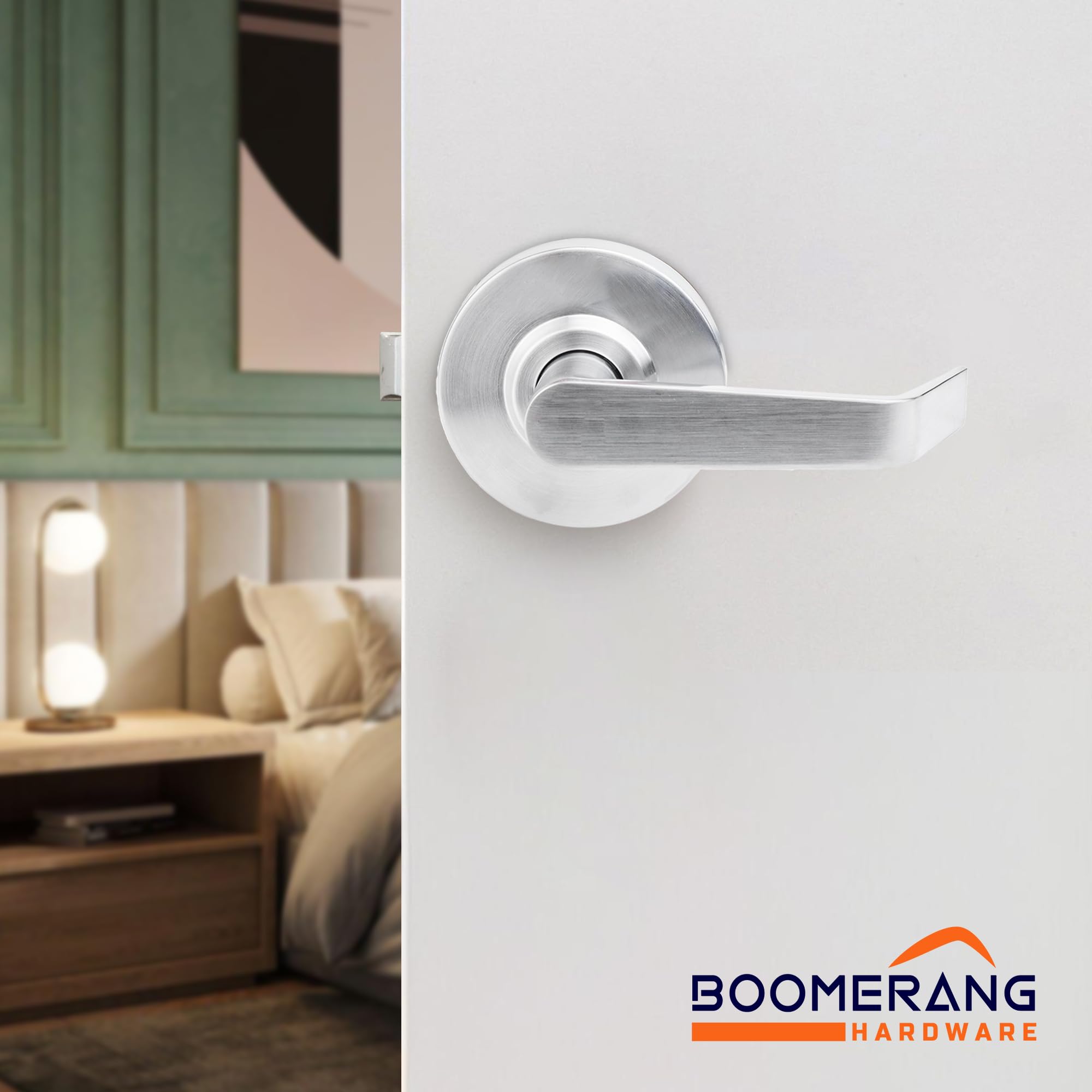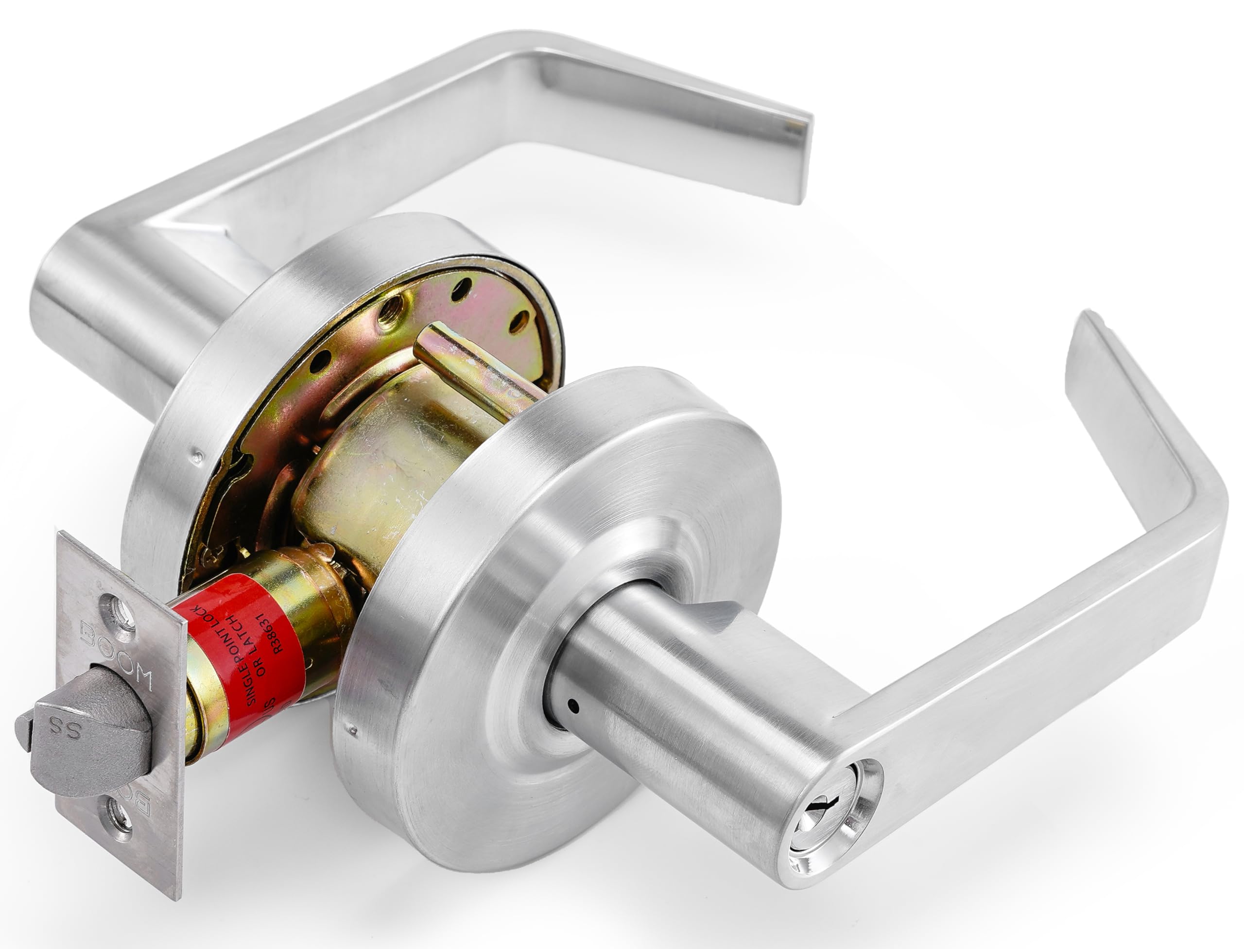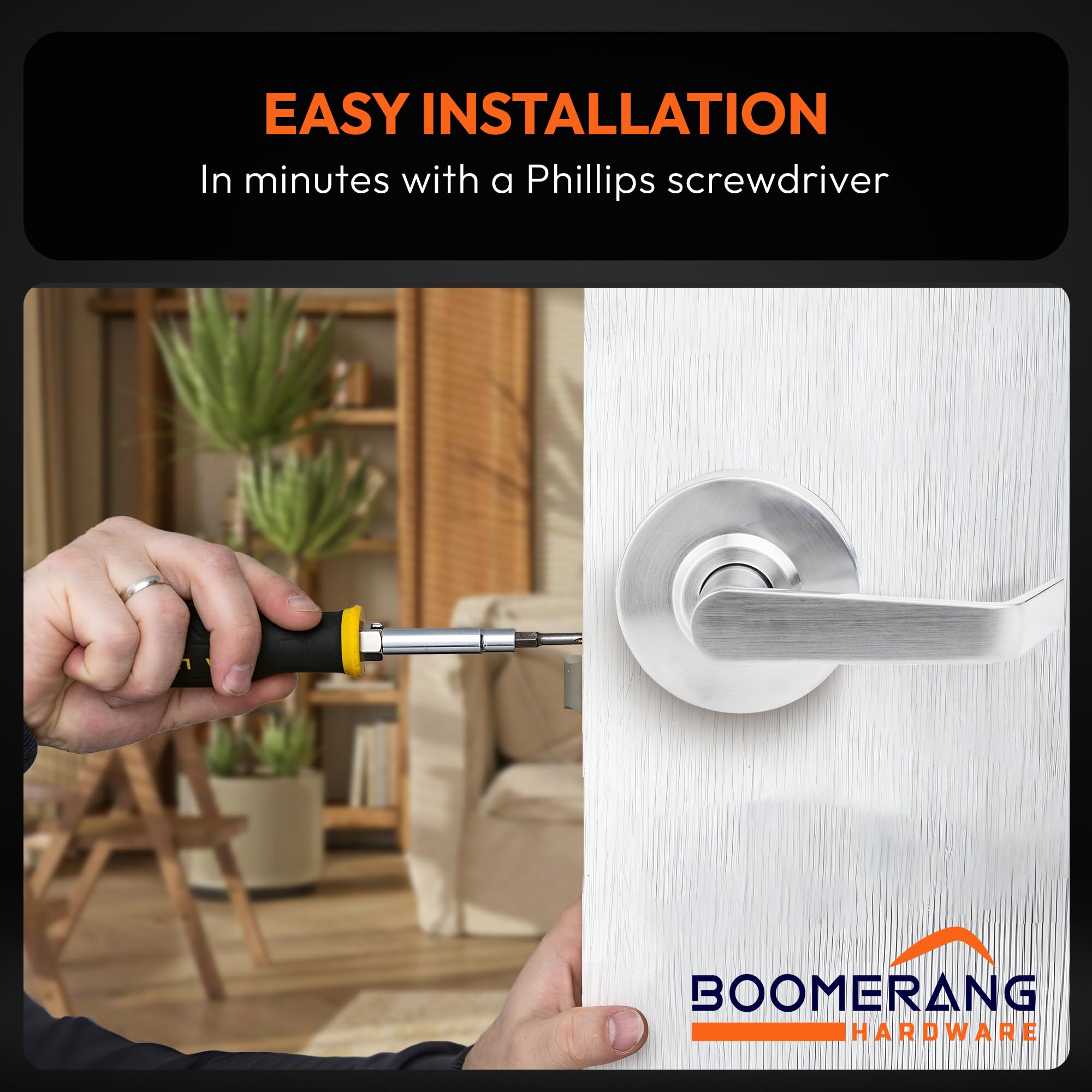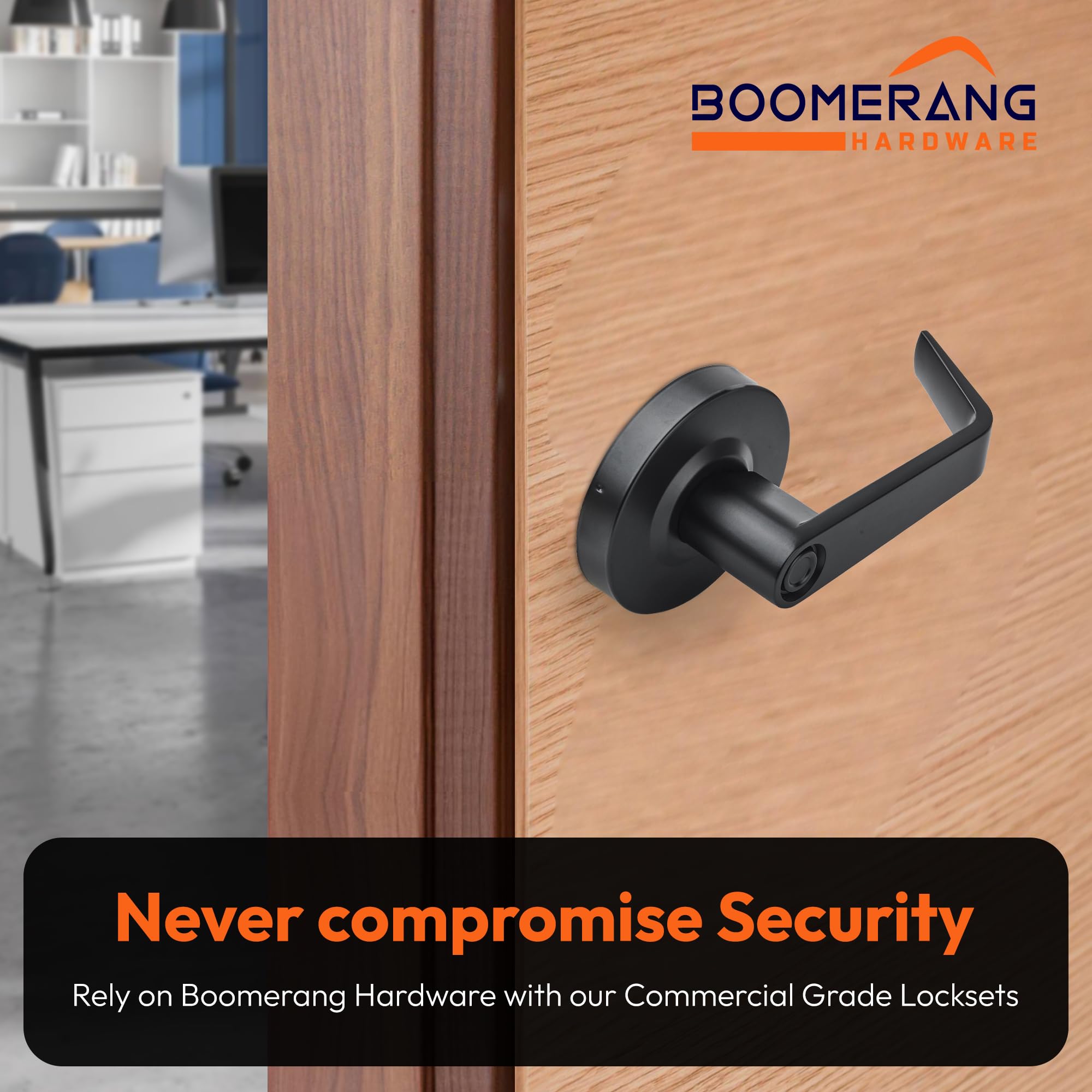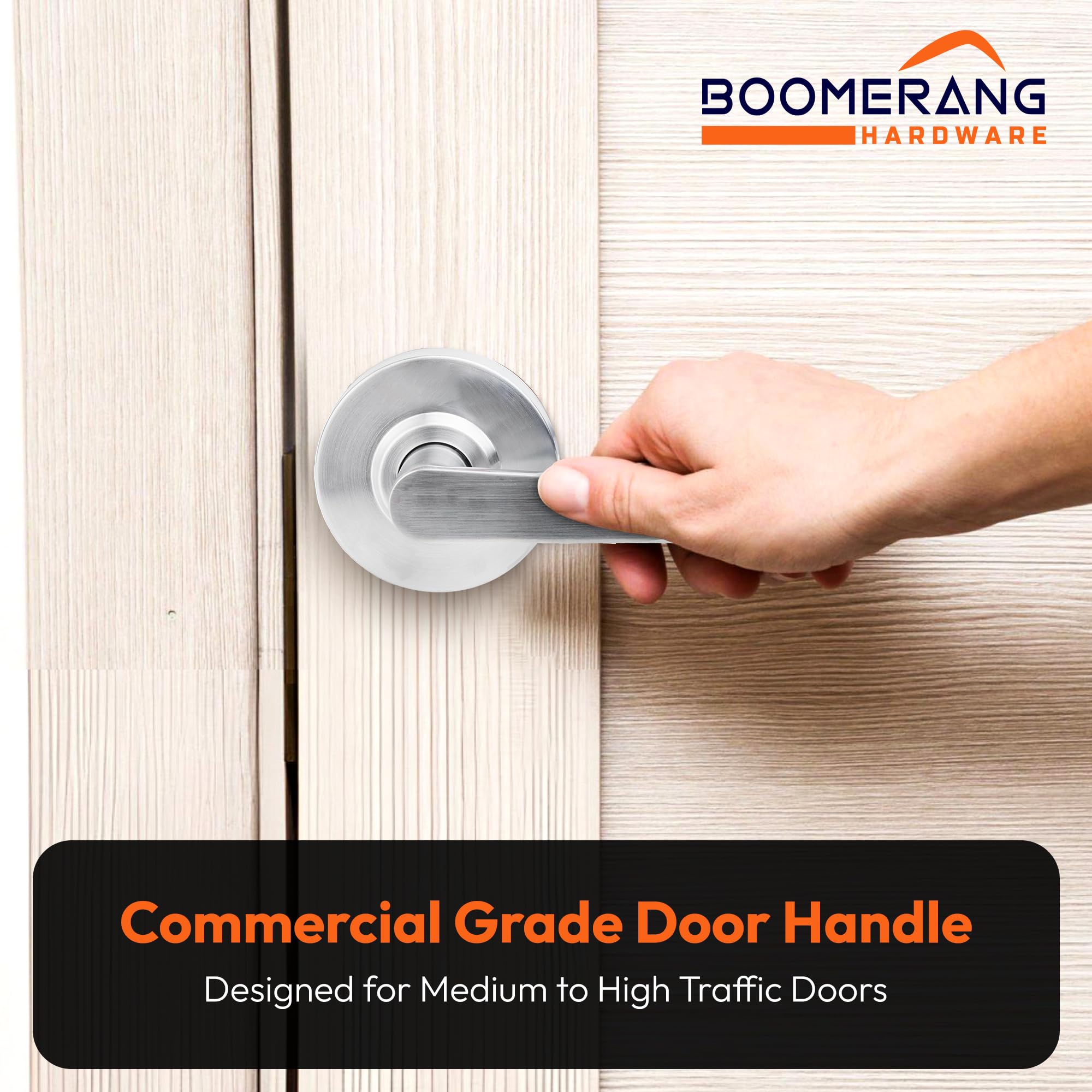 WHAT'S IN A BOX: Each box Boomerang Hardware lever door handle locks includes 1 cylindrical lockset, screws and bolts, user-friendly instructions, 1 ANSI strike, 1 reversible latch unit. The keyed locking functions (Entry, Classroom and Storeroom) include 2 pre-cut keys (C-Keyway (6 pin cylinder) that are re-keyable. The heavy-duty door closer features cold-rolled steel, machined and threaded hubs, and locking nuts to securely bolt the chassis to the door, thereby preventing loosening of the lockset even with hundreds of uses per day.