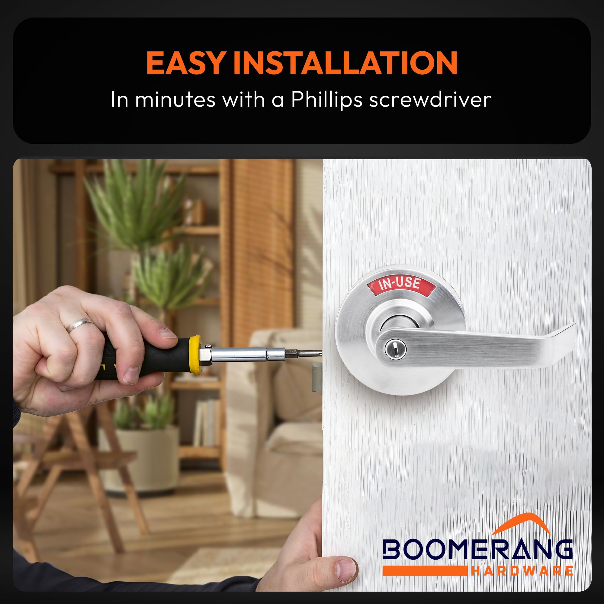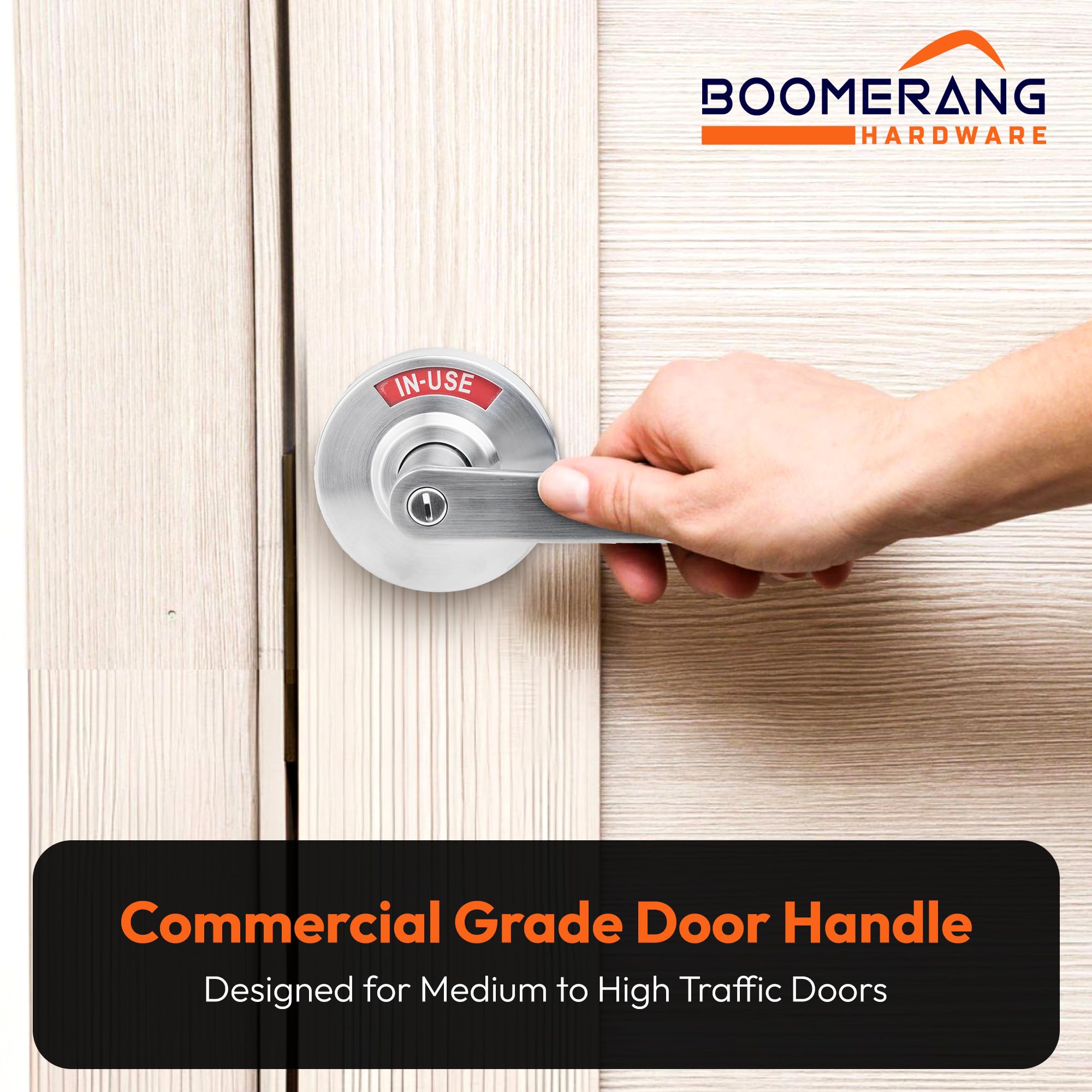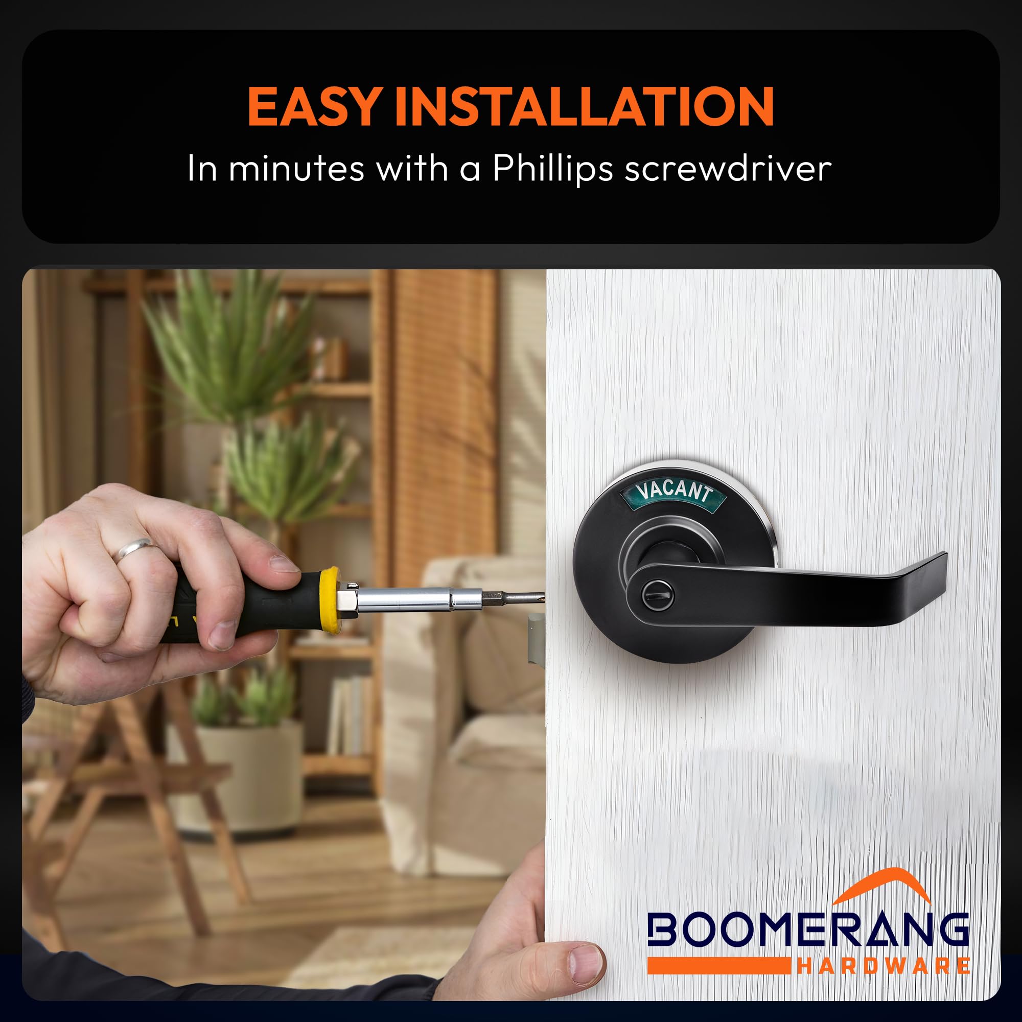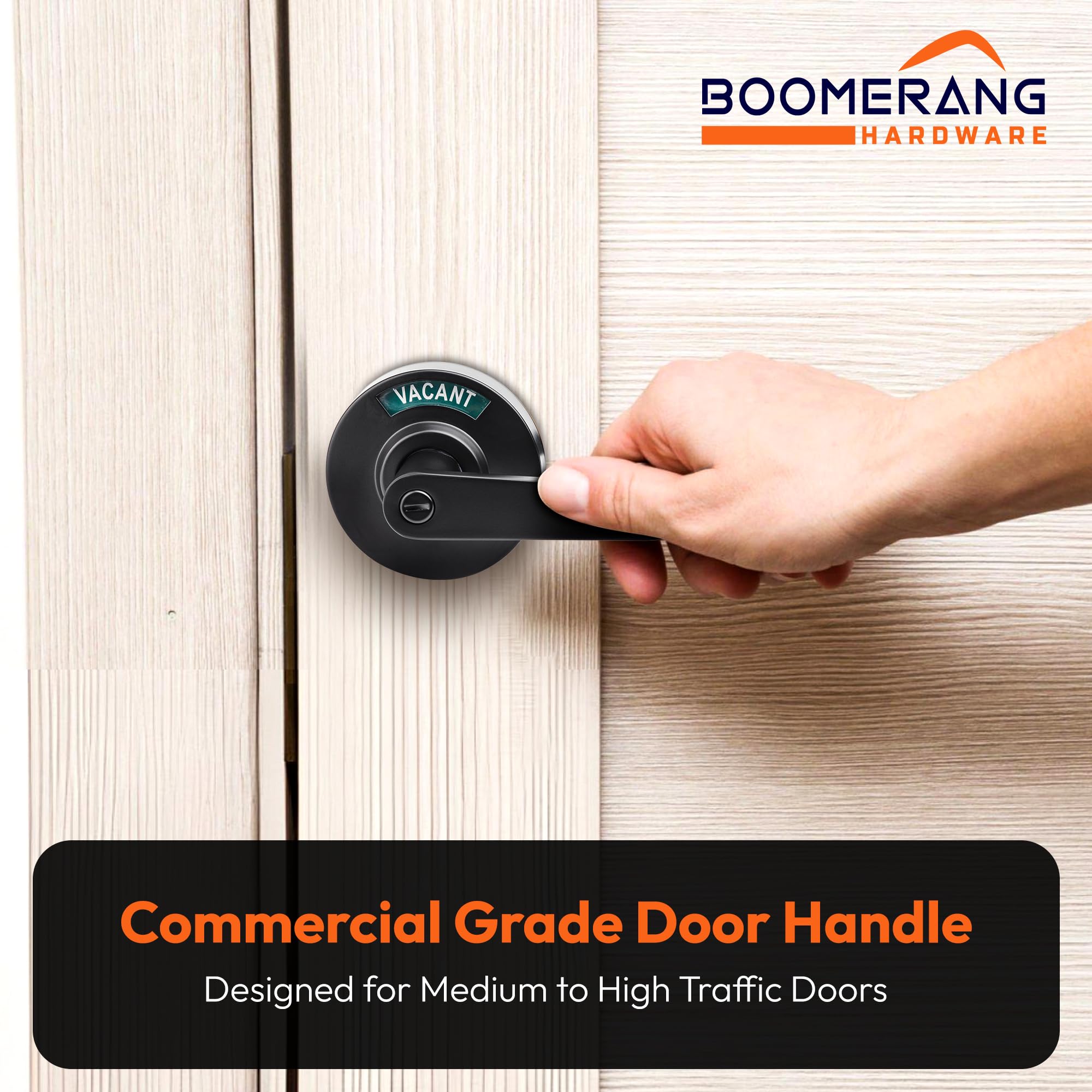 - COLOR & SIZING - The Boomerang Hardware Indicator locks come in 2 finish colors: Satin Chrome/Aluminum finish (26D finish) AND Matte Black (US19) - Fits 1-1/2" to 2" thick Doors and comes standard with a universal latch fitting both 2-3/8" and 2-3/4" backset - NON HANDED: Perfect for either Right Hand or Left Hand doors.
