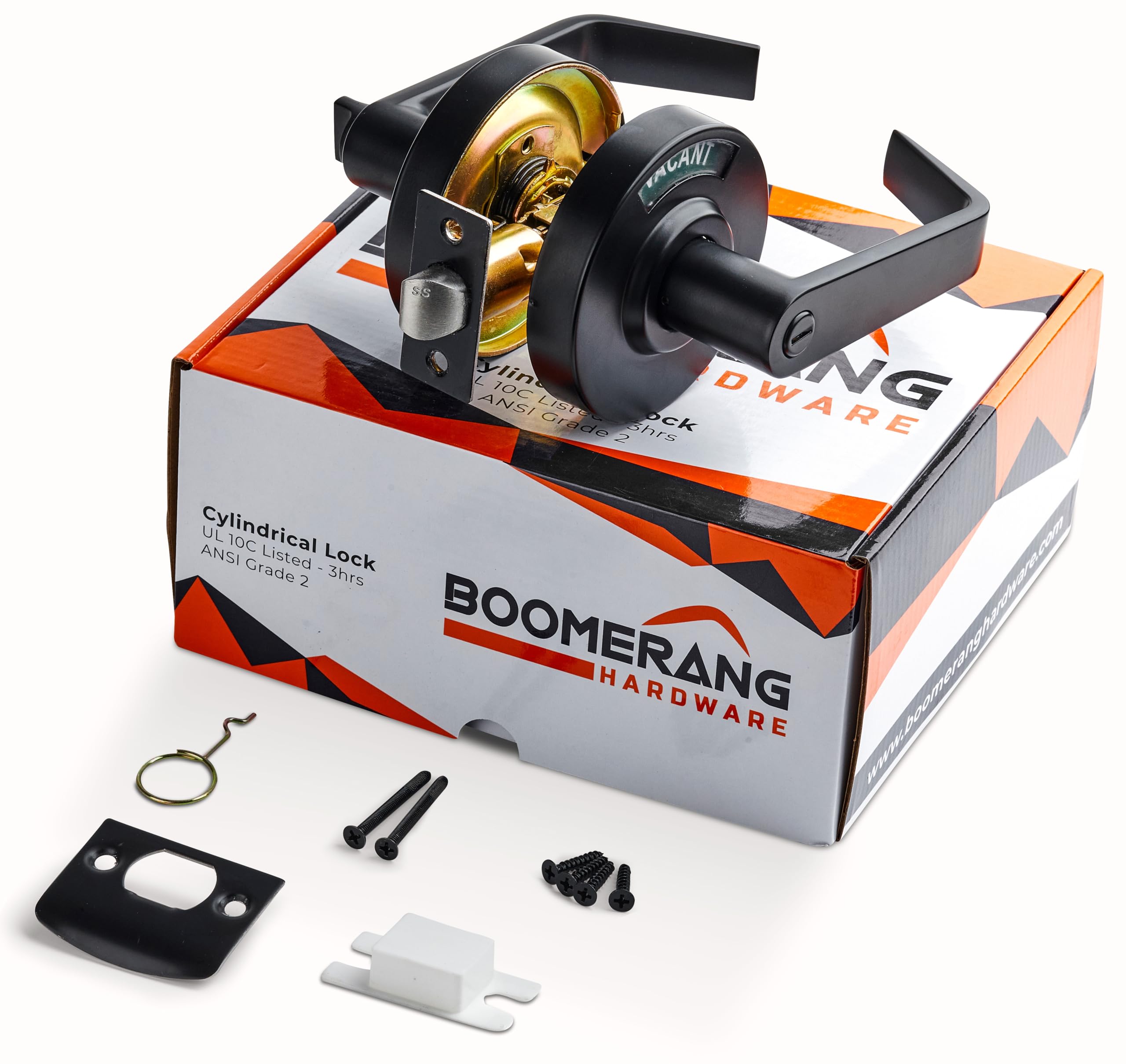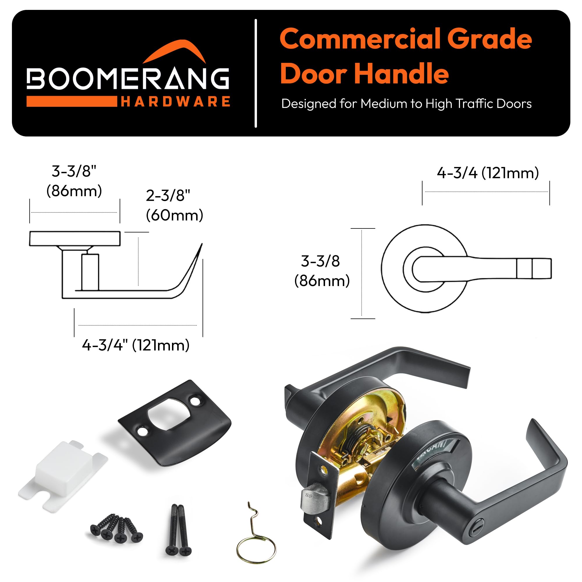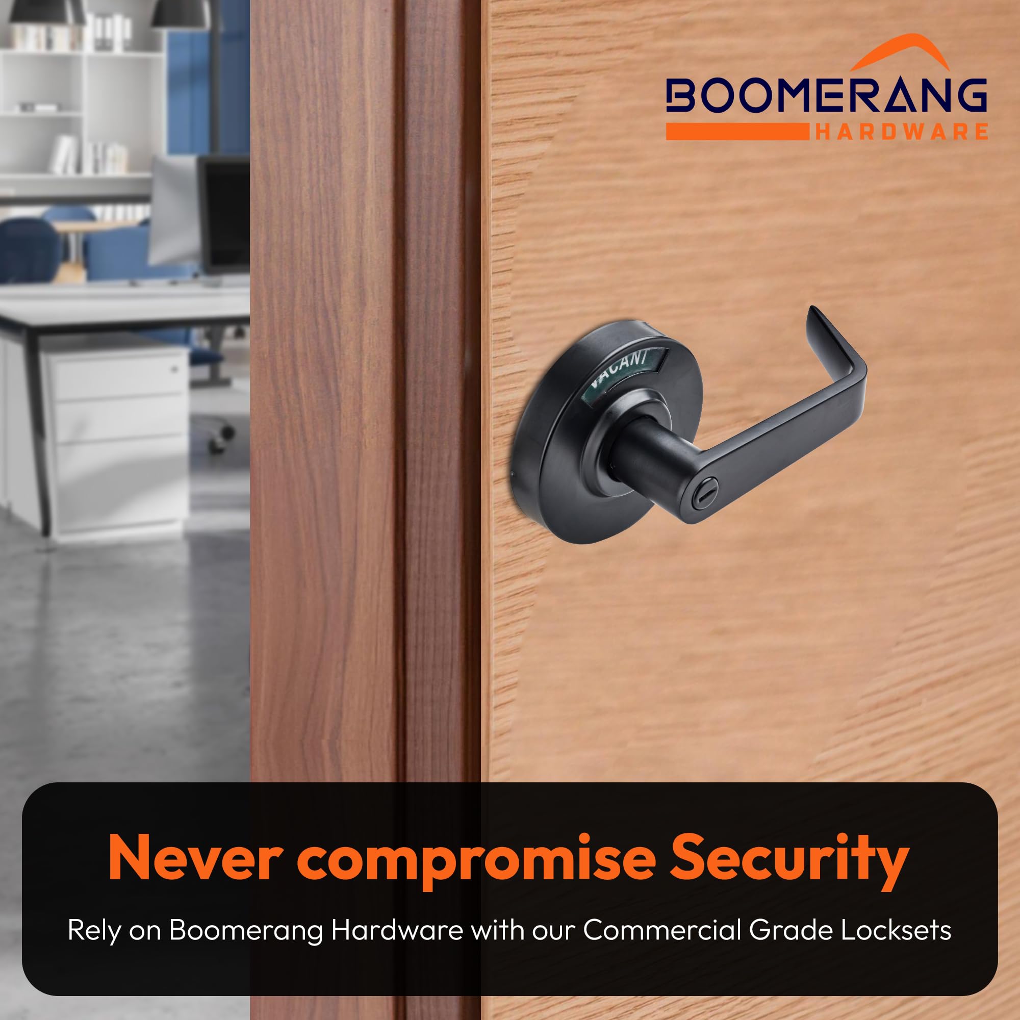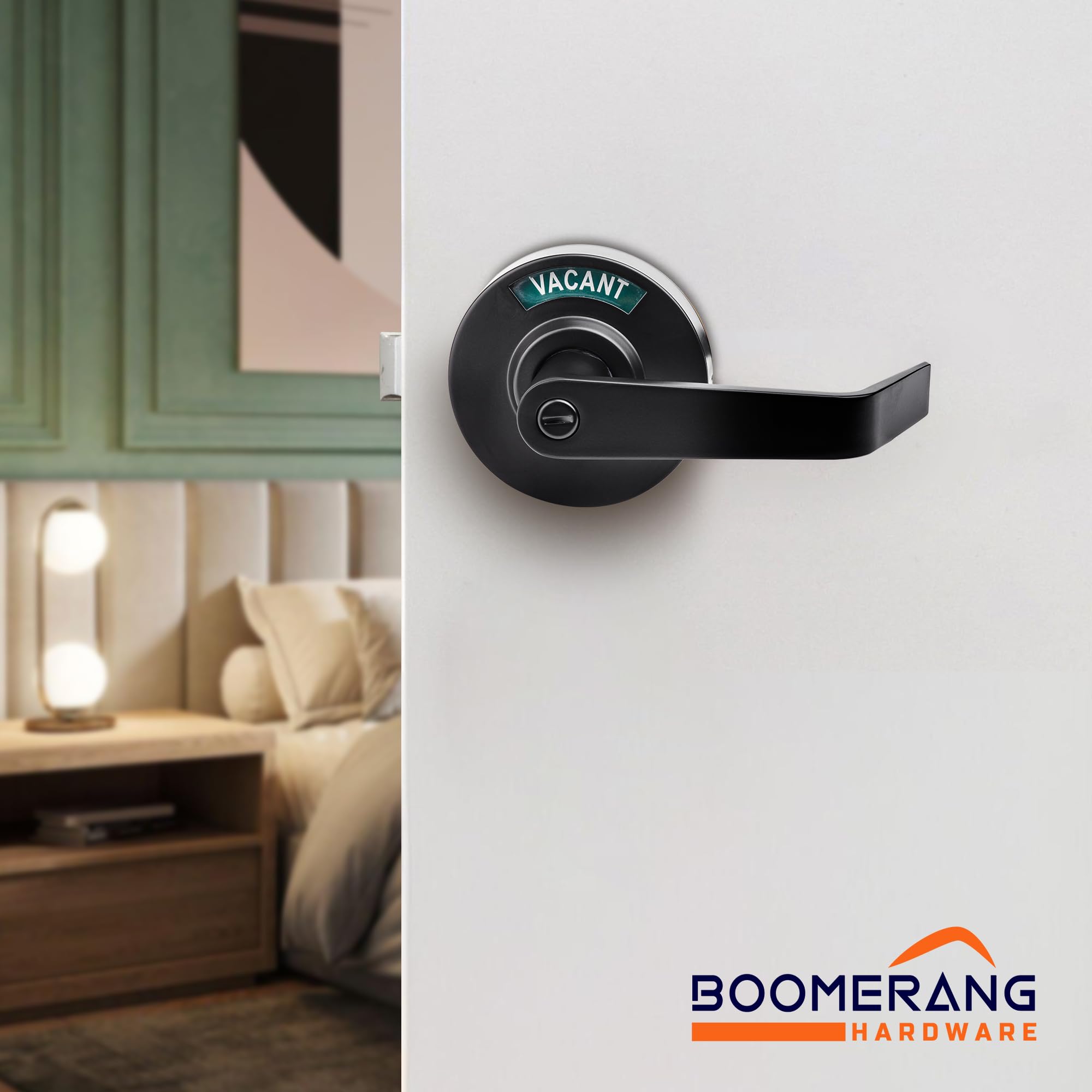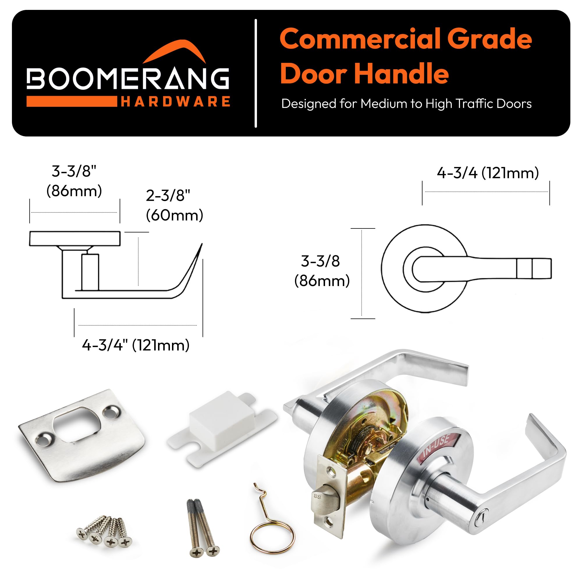 - COLOR & SIZING - The Boomerang Hardware Indicator locks come in 2 finish colors: Satin Chrome/Aluminum finish (26D finish) AND Matte Black (US19) - Fits 1-1/2" to 2" thick Doors and comes standard with a universal latch fitting both 2-3/8" and 2-3/4" backset - NON HANDED: Perfect for either Right Hand or Left Hand doors.