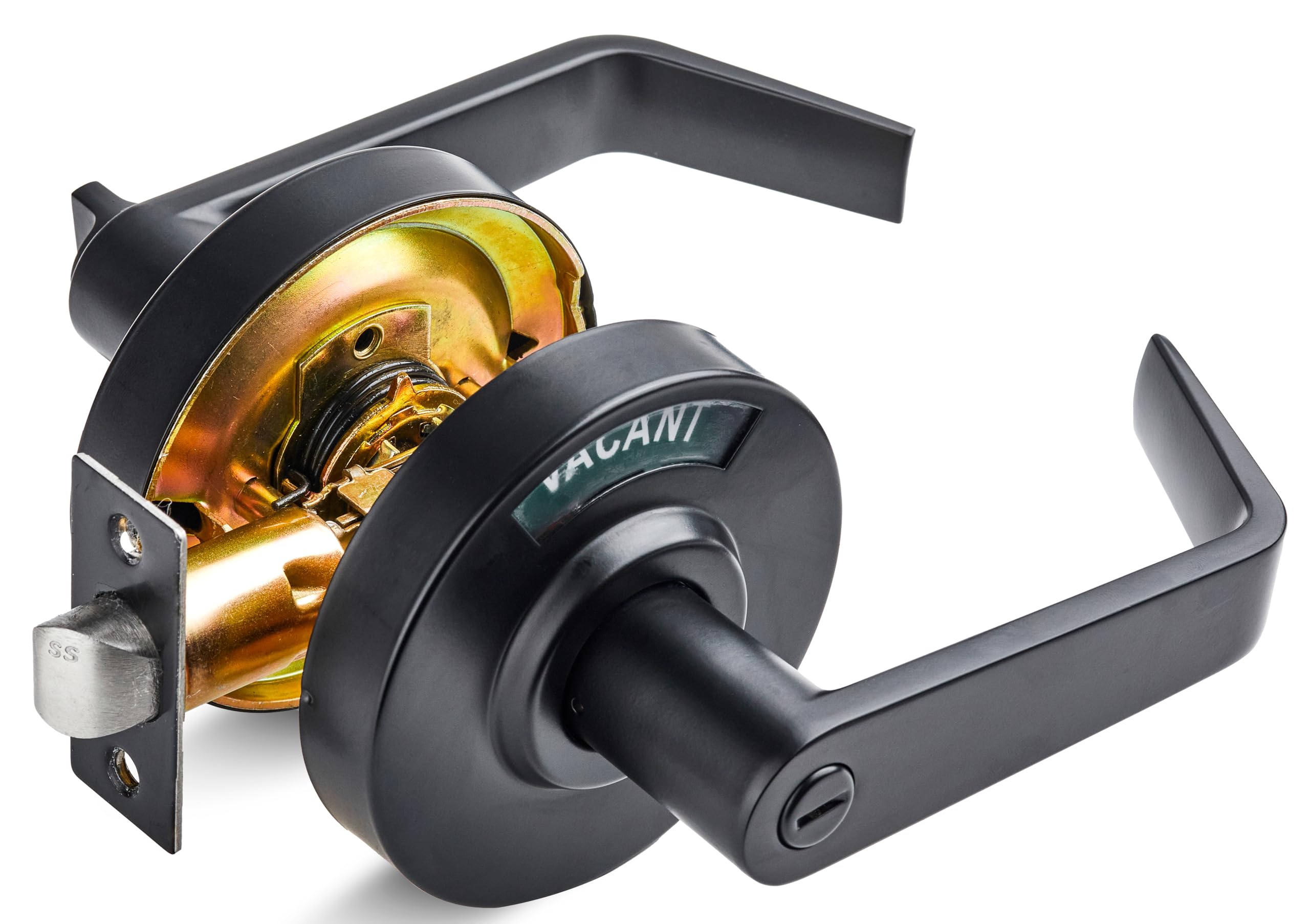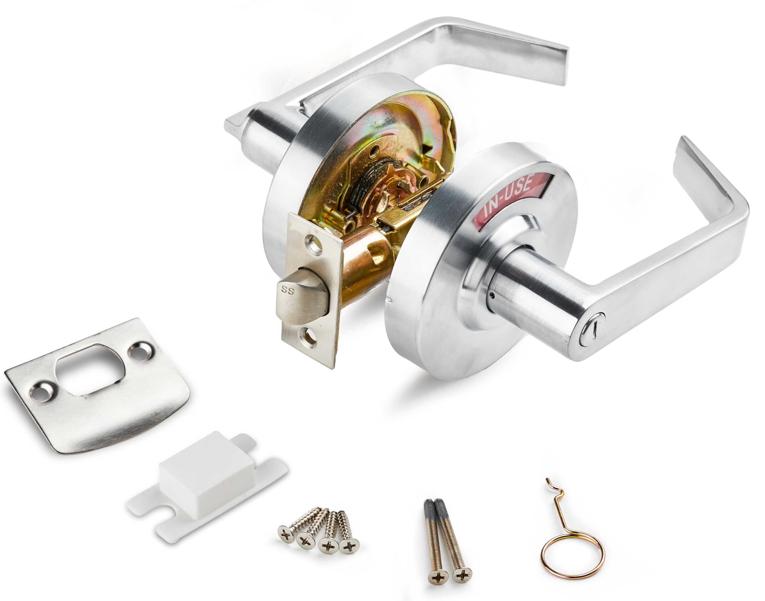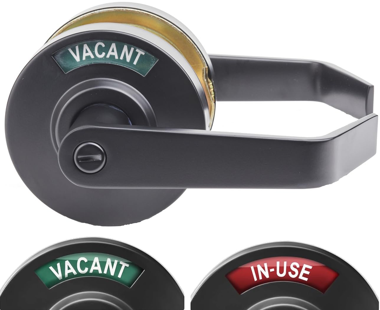 - FUNCTION: Bathroom Privacy Indicator Function (The outside lever is locked by turning a button on the inside and can be unlocked from the outside by using a flat object (coin or screwdriver) to turn the button for emergency entrance. Turning the inside button will toggle the "IN-USE" when locked and "VACANT" indicator when unlocked.